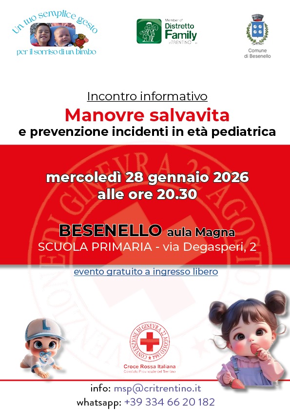 Mercoledì 28 gennaio 2026, alle ore 20.30, presso l’Aula Magna della Scuola Primaria di Besenello, si terrà un incontro informativo dedicato alle manovre salvavita e alla prevenzione degli incidenti in età pediatrica.