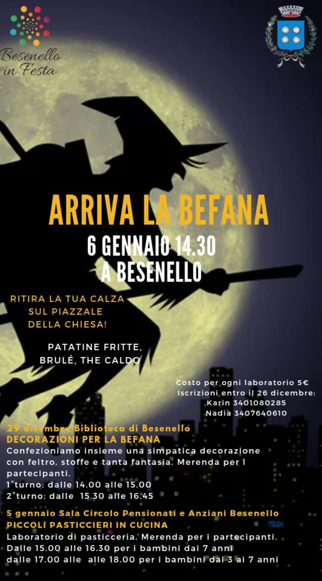 - Creiamo decorazioni per la Befana: laboratorio con feltro e stoffe, lunedì 29 dicembre, presso la Biblioteca comunale di Besenello, dalle 14 alle 15 oppure dalle 15.30 alle 16.45