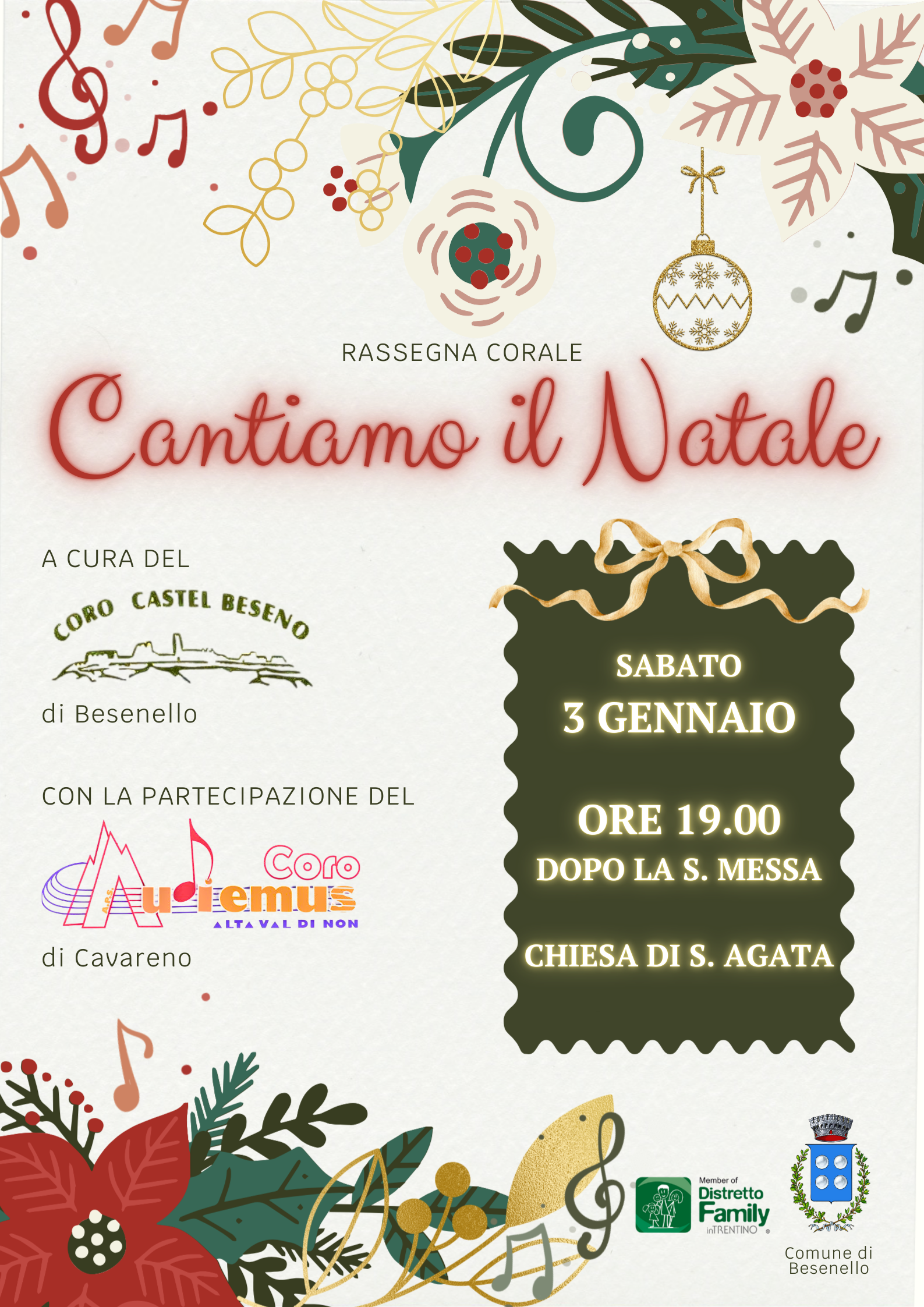 Per celebrare al meglio l'inizio del nuovo anno, la Chiesa del nostro paese si riempie delle note e delle voci dei due cori protagonisti di questa rassegna: il Coro Castel Beseno di Besenello, diretto da Samuele Masera, e il Coro Audiemus di Cavareno, diretto da Enrica Pedron.