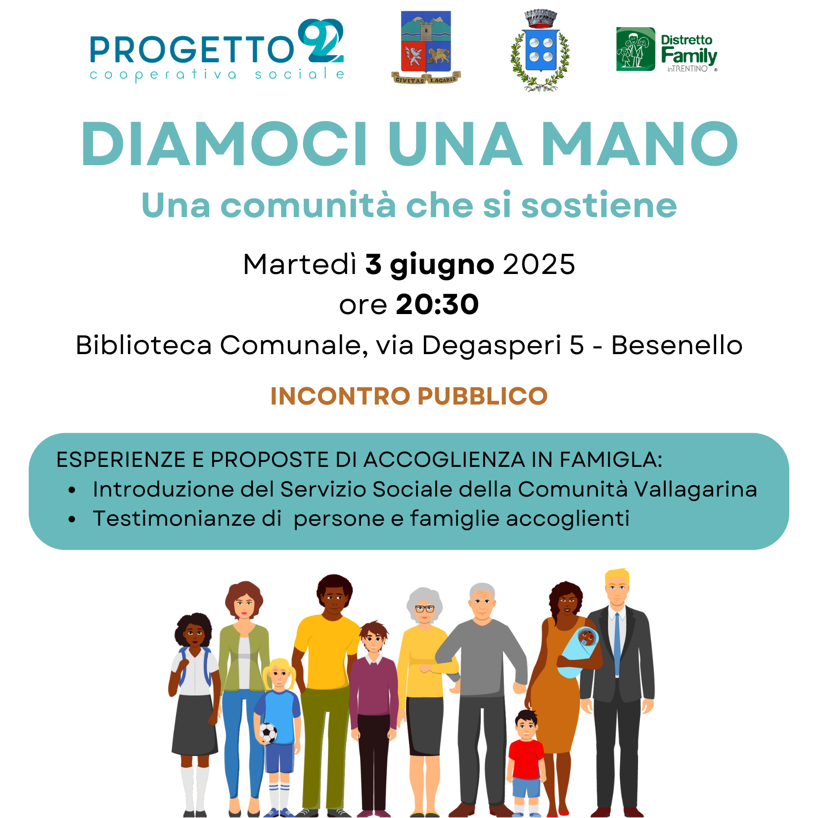 La cooperativa Progetto 92 e il Comune di Besenello, in collaborazione con la Comunità della Vallagarina, presentano martedì 3 giugno alle ore 20.30 presso la biblioteca di Besenello il progetto "Diamoci una mano! Una comunità che si sostiene".
