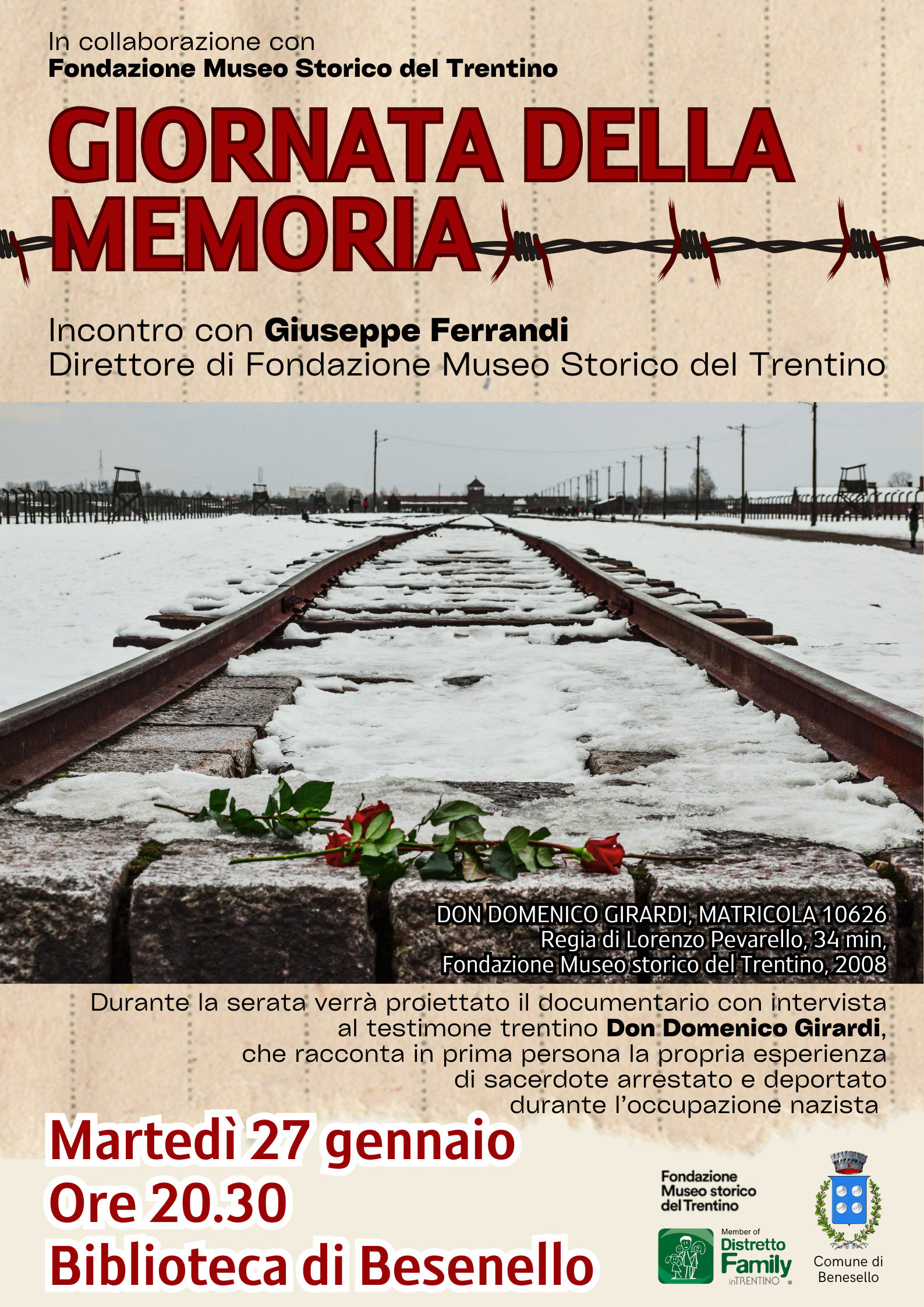 Per celebrare la Giornata della Memoria, in biblioteca il 27 gennaio alle ore 20.30, si terrà un incontro con Giuseppe Ferrandi, Direttore di Fondazione Museo Storico del Trentino.