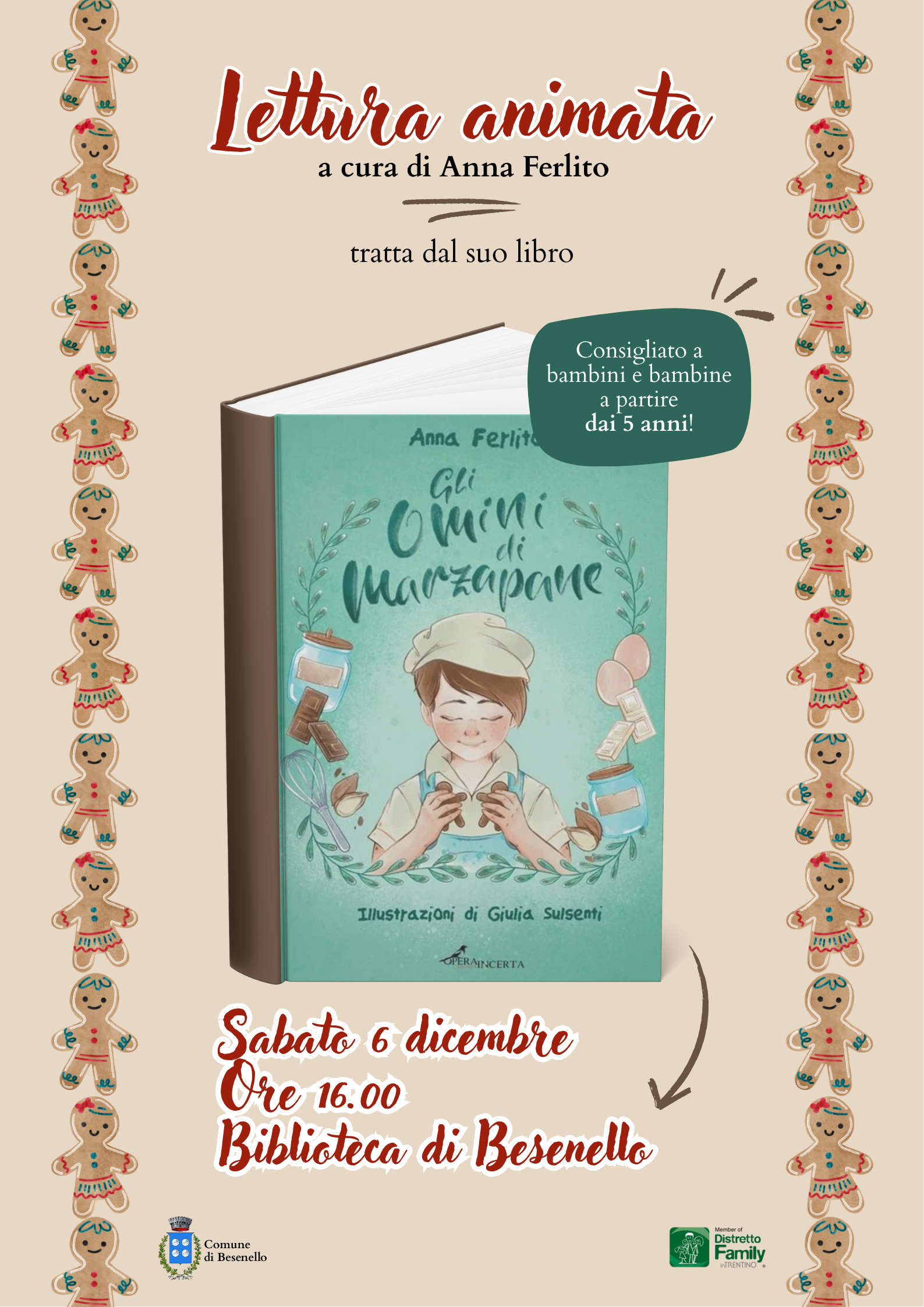 Anna Ferlito, scrittrice di narrativa per l'infanzia, farà divertire i più piccoli con la lettura animata del suo libro intitolato Gli omini di marzapane, delicato racconto che parla di fantasia, dolcezza e amicizia e che li accompagna in un viaggio immaginario dove i biscotti di marzapane prendono vita, diventando protagonisti di avventure sorprendenti.