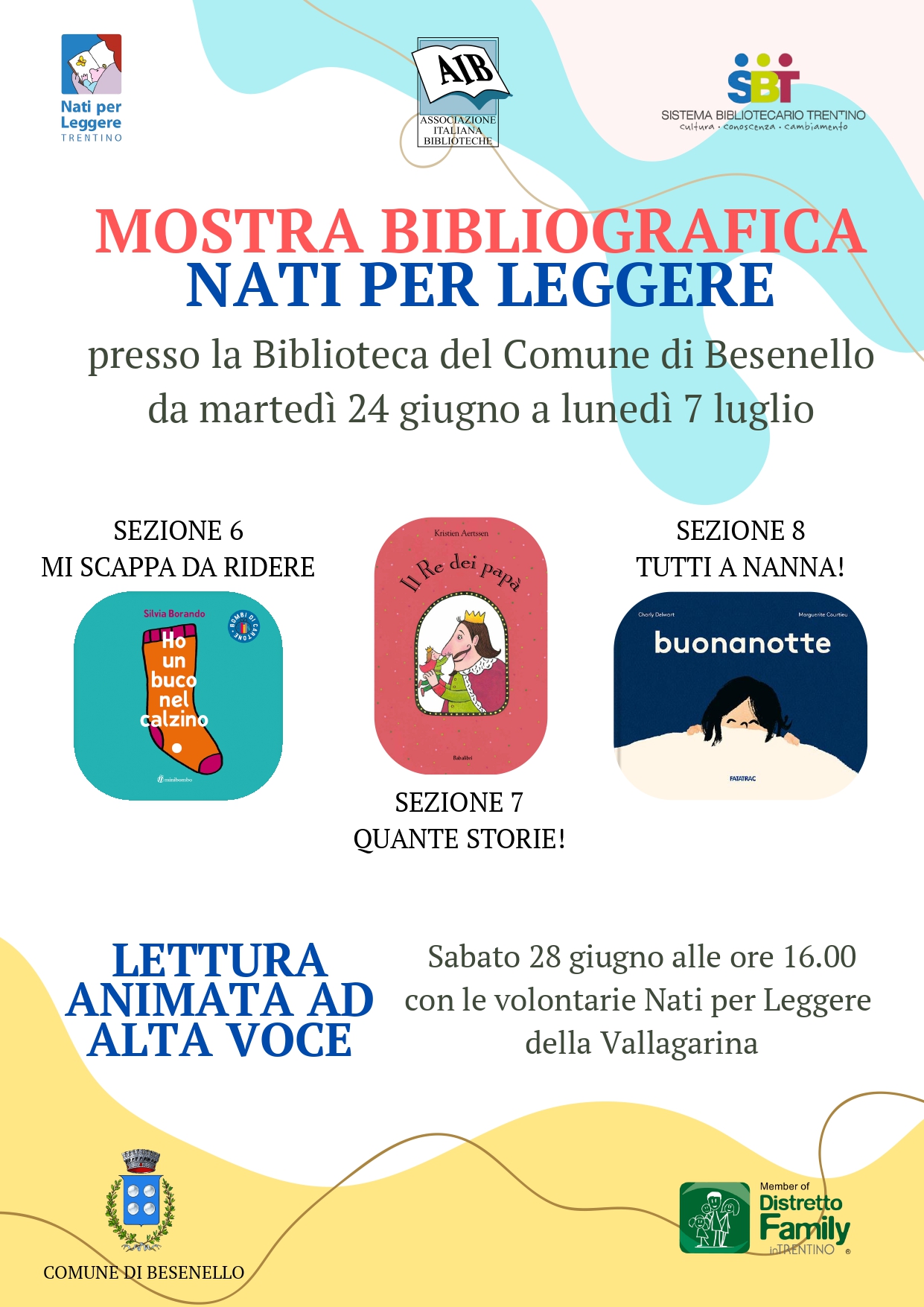Cogliamo l'occasione per ricordare che, sempre presso la biblioteca, dal 24 giugno al 7 luglio, si potrà trovare la mostra bibliografica di Nati Per Leggere, una selezione di libri colorati e divertenti per promuovere la lettura in bambini e bambine tra 0 e 6 anni.