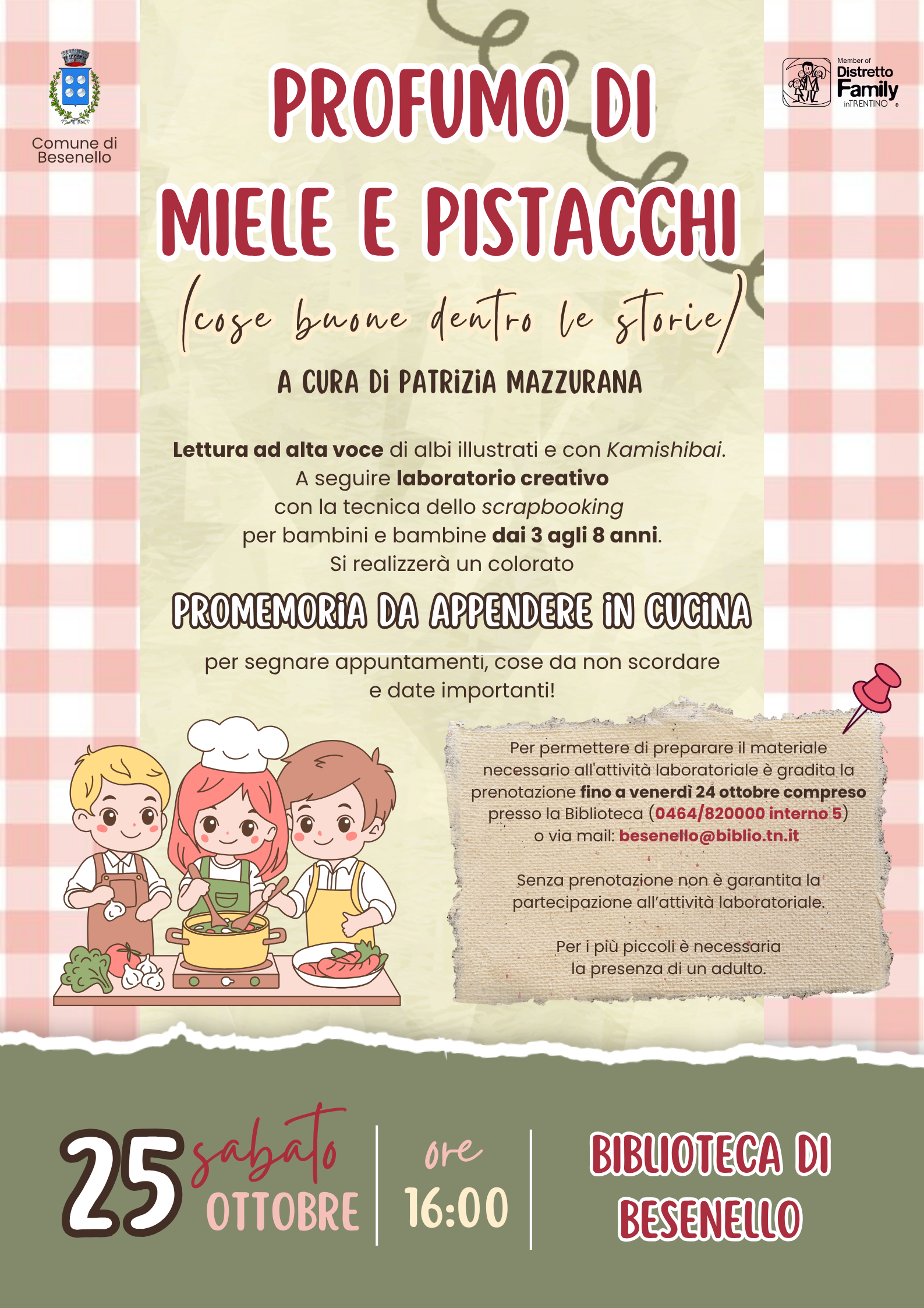Per permettere di preparare il materiale necessario all'attività laboratoriale è gradita la prenotazione fino a venerdì 24 ottobre compreso: