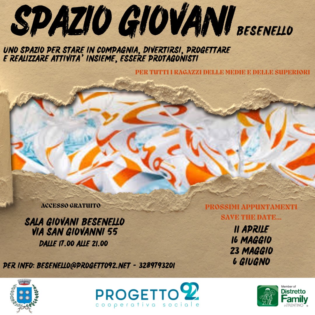 Spazio Giovani Besenello è un'attività organizzata dalla Coop. Progetto 92 e sostenuta dal Comune di Besenello, rivolta a ragazzi e ragazze delle medie e delle superiori, che si svolgerà in sala giovani a Besenello.
