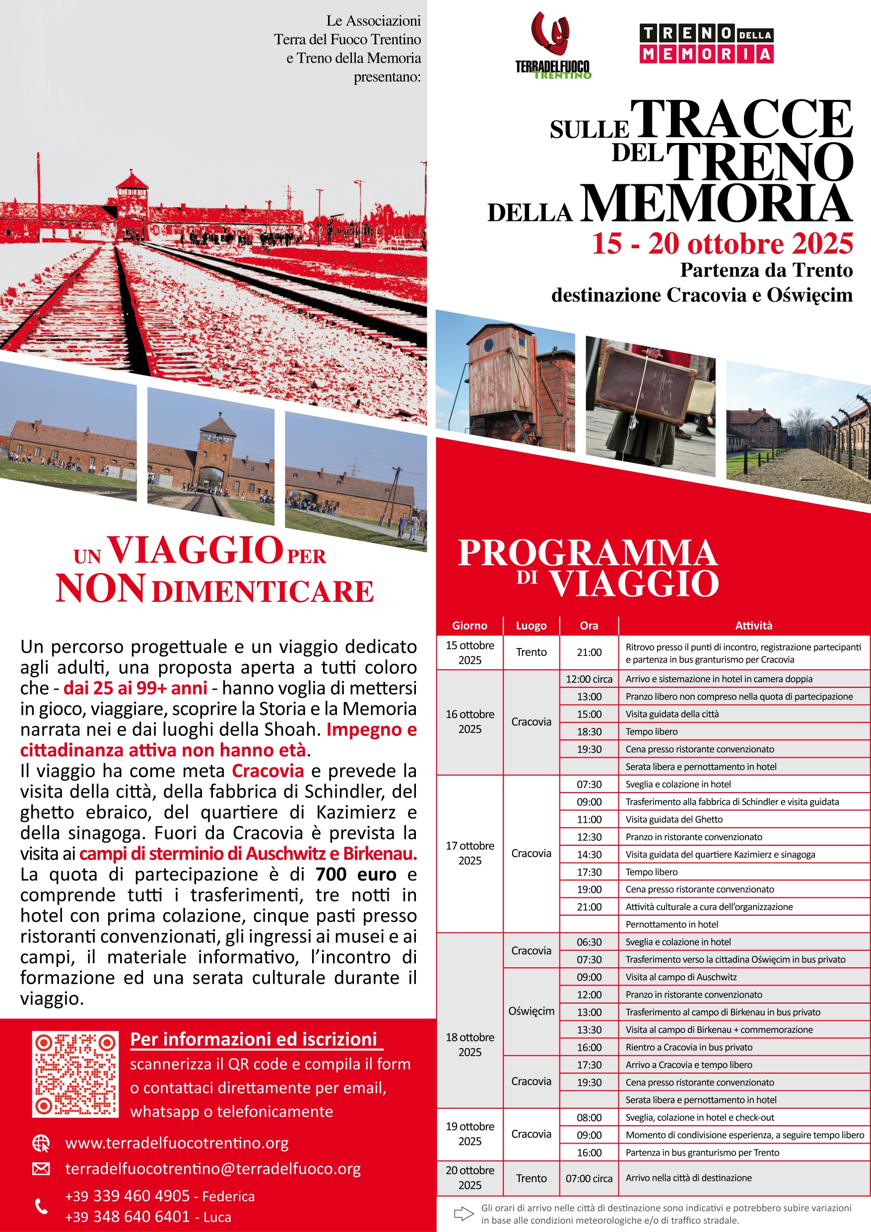 Le Associazioni Terra del Fuoco Trentino e Treno della Memoria propongono il progetto “Sulle tracce del Treno della Memoria”, un viaggio che da Trento porterà a Cracovia e ai campi di sterminio di Auschwitz e Birkenau, dal 15 al 20 ottobre 2025.